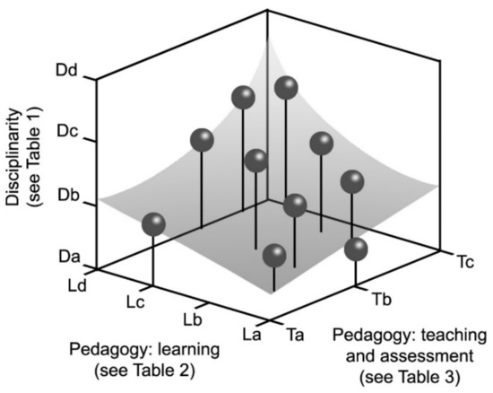 We have also tried to envisage what this approach means for an individual learner. If our model has some validity, it should be possible to plot their position in the pedagogic space. In Figure 3 we have indicated some of these positions by the ‘balls on sticks’. We envisage that learners may occupy various locations within the space defined by the three axes at various times and in different contexts, but that the surface defines the upper boundary for possible learner locations within this space (Figure 2). In particular, we propose that transdisciplinary learning is unlikely to occur where learning is passive and teaching is content-driven (see Section 2.2 and Section 2.3). Based on that assumption, the surface in Figure 2 divides the space into two parts. Beneath the surface are compatible combinations of the three variables: appropriate combinations of the pedagogic variable that support the corresponding disciplinarity (Figure 3). The remaining volume above the surface contains combinations that should be incompatible: pedagogy is inappropriate to the disciplinarity.