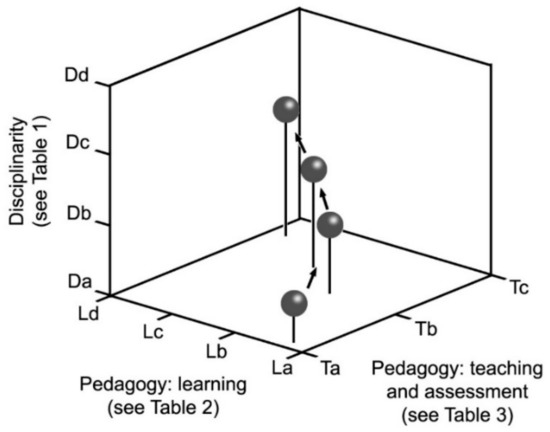 We have developed this conceptual model using the notion of disciplinarity, combining this with ways of learning to visualize the development of students’ perceptions towards emancipatory change agency. Within this space we might also expect students, not only to have gained mastery of individual competencies, but also the ability to combine these in a meaningful and effective way [17,58]. In this case disciplinarity becomes a useful metric for many other areas in higher education in the current environment where, for example: