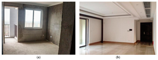 Currently, roughcast and hardbound buildings are submitted in two different renovation ways in China. Roughcast buildings mainly refer to the interior decoration of the house, and the wall surface, the ground surface, and the top surface are not used for the surface layer; only the door frame, the toilet water supply, the drainage interface, and the wire joint. Compared with roughcast buildings, the batch decoration of hardbound buildings is a decoration mode that is vigorously promoted by the government, and is an effective way to reduce renovation waste. The hardbound buildings have been carefully renovated to the building’s construction. For example, the wooden storage ghosts, cabinets, kitchens, toilet walls, floors, etc., have been carefully treated and decorated. In addition, the top surface has been suspended and light bulbs are installed. The difference between two renovation styles can be seen in Figure 1.