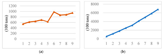 Renovation waste is generated during the process of housing renovation. Therefore, the amount of renovation waste is directly affected by the size of the renovation area, and the area of renovation is more related to marketable housing area of the commodity housing. Therefore, the amount of renovation waste generated is consistent with the trend of the marketable housing area of the commodity housing. From Figure 2, both values generally show an exponential growth trend, but there was a large fluctuation during 2008–2009.