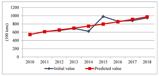 In short, during the period from 2008 to 2018, the fluctuations in the Shenzhen’s real estate market were abnormal between 2008 and 2009. After 2009, the real estate economy in China stabilized, and the amount of residential renovation waste also returned to the exponential growth trend mode. Although sales of the domestic real estate industry declined in 2014, the government adopted effective macro-control measures for the real estate industry, and the property market recovered in 2015. Therefore, it is necessary to reject some abnormal data in the time series to eliminate the impact of a large fluctuation during 2008–2009 for the forecasting model and based on optimistic forecasts of the real estate industry. This paper aims to forecast the amount of residential renovation waste generated in the next five years with the data from 2010 to 2018. Considering exponential growth and little data, GM (1, 1) was selected to forecast the renovation waste for the next five years.