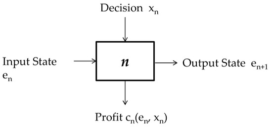 A dynamic programming problem can be divided into different decision stages. Each stage has an input state (en) and, depending on the decision made (xn), an output state (en+1) is obtained. This output state generates a profit (cn), which depends on both the decision and input state (see Figure 1).