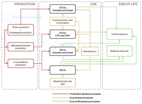 Battery electric vehicles (BEVs) and plug-in hybrid electric vehicles (PHEVs), collectively called Plug-in Electric Vehicles (PEVs), and hybrid electric vehicles (HEVs), have recently been offered as a mass-market alternative to conventional cars with petrol and diesel engines (i.e., Internal Combustion Engine Vehicles (ICEVs) [1]. They have been introduced as a solution to the problem of dependency on fossil fuels, increasing carbon dioxide (CO2) emissions, and other environmental issues [2]. Literature regarding the life cycle assessment (LCA) of PEVs, HEVs, and ICEVs is quite extended. Studies are mainly focused on the “vehicle” system and on the comparison of different technologies (BEVs, PHEVs, HEVs, and ICEVs). Studies concerning cars for individual transportation are dominant with respect to other vehicle types (e.g., heavy or light-duty trucks, buses, etc.) that are investigated in very few works [3]. The different technologies perform differently in terms of environmental impact, and there is not a single technology with good performance in all the environmental impact categories. Hawkins et al. (2012) [4] carried out a comparison of an electric vehicle (EV) and an ICEV over their entire life cycle and found that the greenhouse gases (GHG) emissions decrease of EVs powered by the current European electricity mix is 10% and 24% compared to conventional diesel and gasoline vehicles, respectively. Ellingsen et al. (2016) [5] found that when comparing equal vehicle sizes, the EVs have 20–27% lower lifecycle impact than the ICEVs using the average European electricity mix. Using a Monte Carlo method to simulate EVs use-phase under a wide range of driving conditions, Canals Casals et al. (2016) [6] calculated the GHG emission associated with EVs and ICEVs for the EVs’ top-selling European countries. They found that only France (76% nuclear power energy ratio) and Norway (94% hydropower) ensures global warming potential (GWP) reductions for the whole EVs energy consumption range. Woo et al. (2017) [7] compared the GHG emissions associated with EVs with those from the ICEVs for 70 countries. Their findings indicated that countries with high nuclear power and renewable energy ratios in their generation mix have lower GHG emissions for BEVs. Kamiya et al. (2019) [8] confirmed this and found that British Columbia (mainly hydro-based) has the greatest emission reduction potential for PEVs (78–98%) compared to ICEVs. Furthermore, EVs showed the potential for significant increases in some impact categories (human toxicity, freshwater eutrophication, and metal depletion). According to De Souza et al. (2018) [9], among the technologies, BEVs emerge as the vehicles with the lower environmental charges. The manufacturing phase of BEVs has high relative importance in terms of life cycle impact, and it has a significantly higher impact than ICEVs, mainly due to the production and disposal processes of batteries [10,11,12,13]. Due to energy production and consumption, the use of vehicles is identified as the most relevant life cycle phase regarding the majority of environmental impact indicators considered, both for ICEVs—for which also the effects of lightweighting strategies are analyzed—and the different types of EVs [14,15,16,17]. Moreover, the impact reduction potential of EVs is estimated as gradually increasing with the optimization of the electricity mix (renewable energies penetration) and the wide application of advanced electricity technologies [18,19,20,21]. The disposal phase was found to have a minor influence on the total environmental burdens [22], even if different recycling technologies for the end-of-life of the vehicle could significantly differ in terms of impact [23].