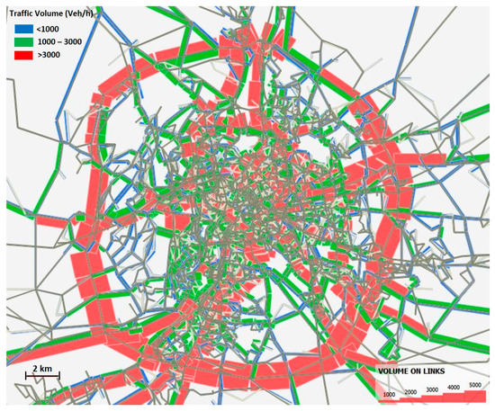 Figure 2 shows the volumes on links resulting from the assignment procedure. A red bar represents high volumes on the link (>3000 vehicles), volumes from 1000 to 3000 vehicles are represented with green bars, and a thin blue represents small volumes (<1000 vehicles). Higher volumes can be observed in the ‘Grande Raccordo Anulare’ (GRA, i.e., a ring-shaped, 68.2 kilometers long freeway that encircles Rome) and in the high-capacity roads connecting the GRA to the city center.