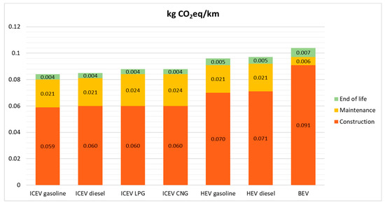 The evaluation of life cycle impacts clearly showed the BEVs have the highest GHG emissions at the vehicle level, which are evaluated as the sum of the construction, maintenance, and end-of-life processes (on average 20% higher than the ones of ICEVs, and 6.5% higher than the ones of HEVs). The Li-ion batteries production process emerged as a relevant contributor, with a share of 16.3% (0.016 kg CO2eq/km) of the whole impact at the vehicle level. The analysis at the vehicle level also highlighted that the construction phase represents the main contributor to the global impact (68.0–70.5% for ICEVs, 72% for HEVs, 87.6% for BEVs), while the end-of-life gives a minor contribution for all the considered vehicles (4–7%). Maintenance activities assumed a relevant role only for the impact related to ICEVs and HEVs (22–28% of the life cycle GHG emissions), while they slightly contributed to the impact of BEVs (about 6% of the life cycle GHG emissions).