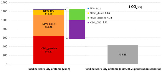 Using as input to Equation (2) the simulation results shown in Table 6 and the coefficients reported in Table 7, we obtain 1247.46 t CO2eq, mainly related to “conventional” ICEVs (gasoline and diesel).