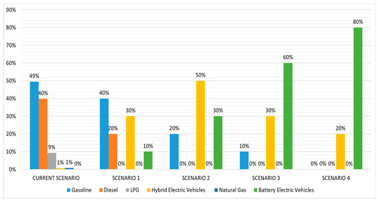 In the previous section, we assumed a 100% penetration scenario to highlight the positive environmental effect of the adoption of BEVs on a real road network. In this section, as an example, we supposed 4 scenarios, shown in Figure 5, characterized by different BEVs and HEVs penetration rate. Table 8 reports the results of the life cycle GHG emissions of the four scenarios. These are intended only to show how the linear equation proposed in this paper (Equation (2)) can be applied in any context characterized by a given fleet compositions and by the specific output of the traffic simulation. As EV adoption rates vary dramatically by country owing to different levels of the various governments’ financial support and the diverse structures of the incentives [55], it is not possible to provide predetermined penetration rates. In Italy, a new incentive named “Ecobonus auto 2019” will start on March 2019. It consists of a monetary incentive ranging from 4000–6000€ to purchase electric cars with a value of up to 54.900€ (VAT included), i.e., non-luxury cars. This is expected to positively influence consumers’ intentions toward EVs.