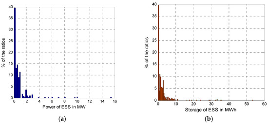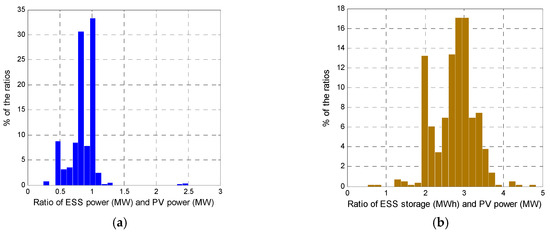 Distribution of ESS and PV’s capacity ratio: (a) kw/kw, (b) kwh/kw.