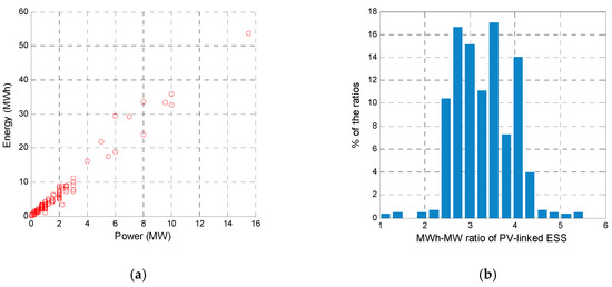 (a) Scatterplot of PV-linked ESS in energy storage and power, and (b) distribution of ratios.