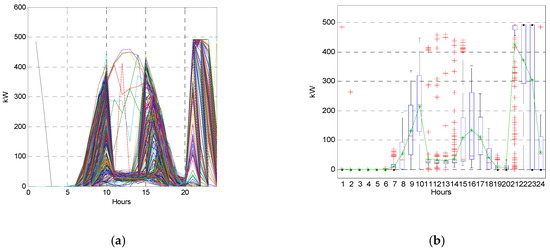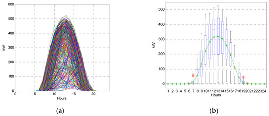 Figure 4 and Figure 5 shows one-year daily generation patterns of a 600 kW PV power plant and 600 kW PV with 500 kW and 1800 kWh ESS, respectively. Figure 4a and Figure 5a show all the 24 h generation patterns of 365 days per year, and Figure 4b and Figure 5b show the distribution by one-hour time zones. For the distribution in Figure 4b and Figure 5b, the middle red lines in the blue bars are the median, and the bottom and top of the blue boxes are 25% and 75% points, respectively. The top and bottom ends of the vertical dotted lines indicate maximum and minimum. The red-crosses are outliers beyond the distribution range. Also, the green lines with star markers represent the averages.