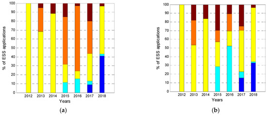 Annual ESS market share in (a) MW market and (b) MWh market.