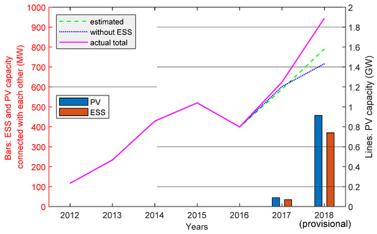 The purple line in Figure 8 represents the actual total PV installation capacity per year since 2012 when PV began to be included in the RPS system. The green broken line shows the trend toward 2017 and 2018 derived by linear regression assuming growth without considering ESS, and the blue dotted line means the real PV capacity without ESS linkage.