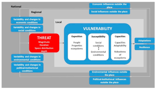 - Blaikie, P.; Cannon, T.; Davis, I.; Wisner, B. Vulnerabilidad. El Entorno Social, Político y Económico de los Desastres; LA RED/ITDG: Bogotá, Colombia, 1996. [Google Scholar]