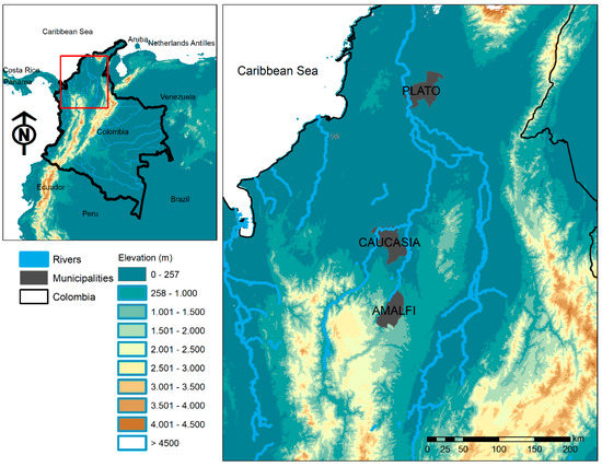 - Alcaldía Municipal de Amalfi. Plan de Desarrollo Municipal Amalfi Antioquia 2016–2019 “Amalfi, Amor y Pasión de Todos”; Alcaldía Municipal de Amalfi: Amalfi, Colombia, 2016. [Google Scholar]