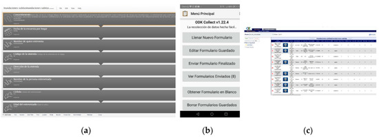 - Universidad de Washington, Department of Computer Science and Engineering. Open Data Kit—ODK; Universidad de Washington, Department of Computer Science and Engineering: Washington, DC, USA, 2015. [Google Scholar]