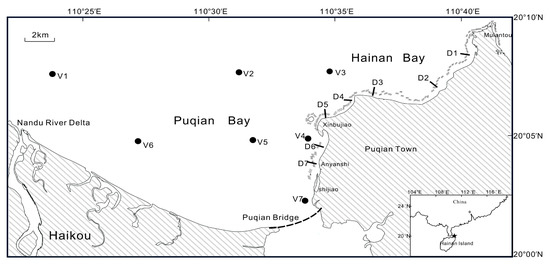 In order to understand the hydrodynamics environment around NE Hainan Island and its effect on the coral reefs and adjacent coastline behind them, one site (V3) for tides and seven sites (V1–V7) for currents were established for real-time monitoring on various hydrological parameters (Figure 1) (Table 1). Tidal monitoring was carried out with two Tide Gauge Recorders (RBR-TGR-2050, Ottawa, Canada) from June 26 to October 13, 2017. The instruments were fixed with special steel, and one recorder was placed on the seabed and the other in the air above the sea level. Water level line and air pressure were recorded at a sampling interval of 10 min. Current monitoring was carried out at seven sites with two measuring instruments during the spring tide of the between July 11 and 12, 2017. Acoustic Doppler Current Profilers (RDI-WHS-600, Silicon Valley, CA, USA) were used at the V1 to V3 sites at >10 m deep. The current meters (Aanderaa-RCM9, Norway) were used at the V4–V7 sites where the depth was <10 m.