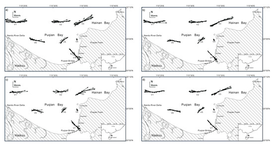 Tidal current directions in different water layers: (a) Surface current, (b) Middle current, (c) Near-bottom current, (d) Vertical mean current.