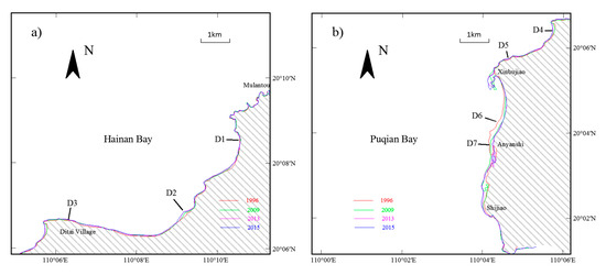 Coastline evolution in the NE Hainan Island. (a) Hainan Bay, (b) Puqian Bay