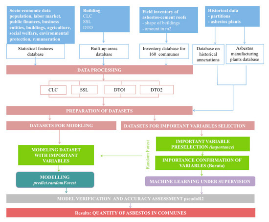 Asbestos is a mineral which, due to its physical and chemical properties, has found wide application in many areas of industry and economy [1]. Traditionally, asbestos fibers were mainly used in the construction industry, in which asbestos fibers were used to manufacture asbestos–cement products, constituting over 80% of the products used, which were mainly used in roofing materials and façade claddings [2]. Due to the pathogenic effect of asbestos, in 1997, the ban on the production of asbestos-containing products was introduced in Poland; their use in an environmentally and human health safe manner is allowed until the end of 2032 [3]. Exposure to asbestos causes a wide range of diseases, such as asbestosis, as well as cancers such as malignant mesothelioma and lung cancer [4]. The risk assessment of asbestos-related diseases requires detailed data on the quantity and where the asbestos–cement products are used [5,6,7]. Statistical models are used to assess the potential risk of asbestos-related diseases, e.g., pleural mesothelioma [8] or lung cancer [9], based on the total amount of asbestos fibers used in the production per country population. Due to the lack of data on the quantity and the spatial distribution of asbestos–cement products used, research is undertaken to assess the risk of developing asbestos-related diseases on the basis of asbestos consumption indices in production per country’s population [10,11]. There is a lack of detailed data on the number of products used, spatially broken down into administrative units, which could significantly affect the obtained results [12]. In the National Program for Asbestos Abatement in Poland [3], it was estimated that approximately 14.5 million tons of asbestos-containing products are in use. These estimations were based on the approximation of data on asbestos fibers imports. However, there were no attempts undertaken to present the spatial distribution of the aforementioned products in relation to communes. The objective for this paper is to present a new and promising solution for developing the spatial distribution of the asbestos–cement products used across the country by the application of a machine learning algorithm, i.e., Random Forest. The motivation behind this research is to support the decision makers who are interested in public issues concerning asbestos abatement safety for humans and the environment, as well as to support them with the overall estimation of asbestos–cement products in use in Poland to assess the environmental risk of asbestos exposure to humans.