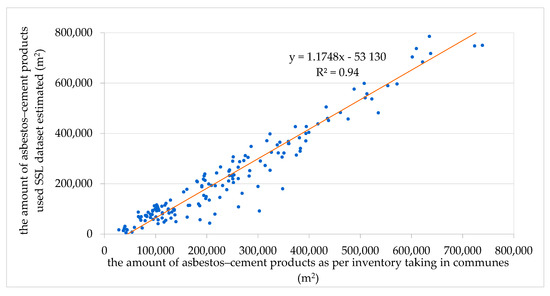 Although the percentage of communes fulfilling the obligation to keep a register in the Asbestos Database is high, there are no mechanisms for checking the completeness of data [45,46]. In previous research undertaken by Wilk et al. [47], it was estimated that 8.2 million tons of asbestos–cement products are used in Poland, i.e., approximately 0.4 million tons less than in the analyzed SSL dataset, and the pseudo-R2 parameter reached a value of 72.9%. In previous research, modelling was executed using all variables that had been verified as important, regardless of the calculated value of the coefficient Z, which is the significance of variables. In the present research, the selection of variables relevant for four datasets was carried out using only variables that were confirmed as important in the modelling process, which has contributed to an increase in the fit of the model to 75.85%. Nevertheless, similarly to the previously obtained result, the highest value of the pseudo-R2 parameter was achieved for the SSL dataset, and the amount of asbestos–cement products calculated on its basis was estimated at approximately 7.8 million tons.