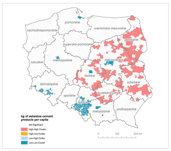 Communes with a high amount of asbestos–cement products per person surrounded by communes with a similar number of asbestos products per capita are located in Central and Eastern parts of Poland (Łódzkie, Świętokrzyskie, Mazowieckie, Podlaskie and Lubelskie). In Śląskie, communes with a small amount of asbestos–cement products per person were noted. This is due to the fact that in Śląskie, there exists a concentration of agglomerations, which causes the amount of asbestos–cement products per capita to be quite low (Figure 6).