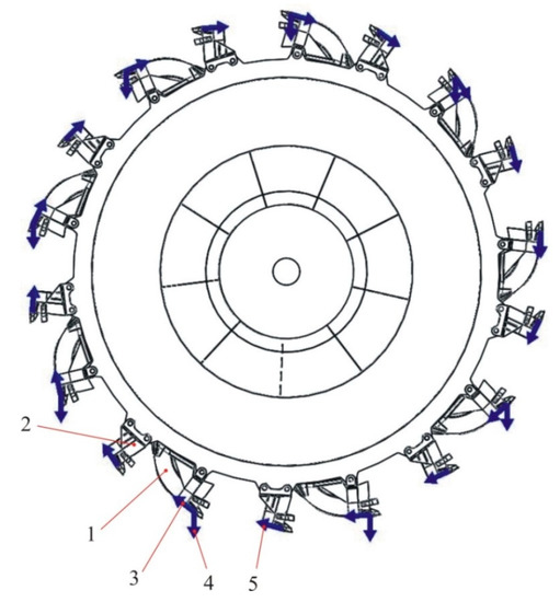 The ERc 1400-30/7 BWE’s bucket wheel (1—cutter–loader bucket; 2—cutter bucket; 3—cutting force on the cutter–loader bucket; 4—force corresponding to the weight of the material; 5—cutting force on the cutter bucket) (Source: Authors).