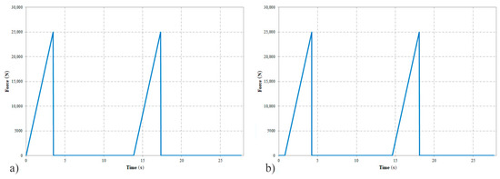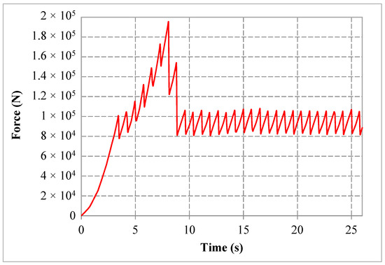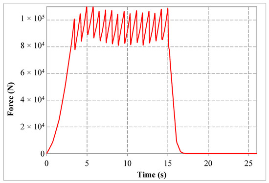 The exciting force is applied to the surface of the bucket wheel’s shaft, as a uniformly distributed force on its support surface (Figure 8), and is a function of time (Figure 9). Here, we present the variation in the force at the bucket wheel’s shaft when the excavated material is homogeneous.