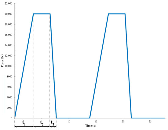 The offset time that occurs between two successive curves in Figure 4a,b, respectively, is given by the rotation speed of the bucket wheel. For the model of the ERc 1400-30/7 BWE, the speed is 4.33 rpm [2], which leads to an offset time of 13.86 s between two successive cuts of the same bucket. The time gap between the diagrams in Figure 4a,b corresponds to an angular distance between two successive buckets (one cutter and one cutter–loader) of during a 0.77 s time interval. The weight of the loaded material only refers to the cutter–loader buckets at a discharge rate of 39 buckets/min, which means an identical gap of 13.86 s. Only the duration of the process is longer, as to the time of the cut, t1 the lifting and discharge times (t2 and t3) are added. By overlapping the three forces (considering the offset as shown) and reducing them to the bucket wheel’s shaft, the time variation of the resultant force on the shaft is obtained.