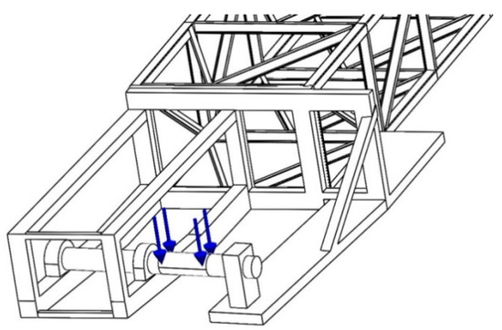The main static loads (mass forces) to which the boom and its elements are subjected are presented in Table 1, where the type of SolidWorks® Simulation specific load is also defined (Figure 6) [10]. It is known that both the conveyor belt mounted on the boom and its kinematic drive chain also generate vibrations. The model adopted in this paper only considers the static effect of their presence according to Table 1, thus highlighting the dynamic response in time of the boom structure under the action of the excavation forces. The values given in Table 1 are based on the manufacturer’s specifications [2].