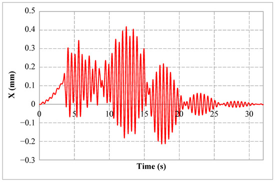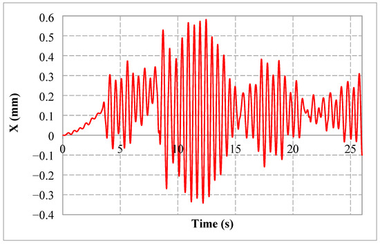 Figure 17, Figure 18 and Figure 19 represent the variation over time in the deformation of the BWE’s boom structure for the X, Y, and Z directions when, as shown in Figure 10, a shock-type load is applied over time. It can be seen for all directions that the sudden occurrence of hard material inclusions in the homogenous material of the excavated face produces a transient regime, after which the oscillations stabilize in a permanent regime.