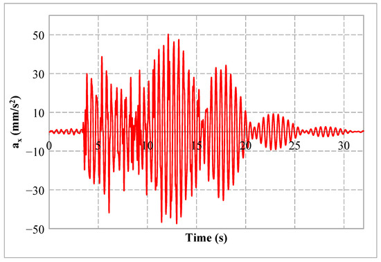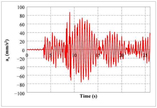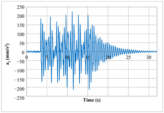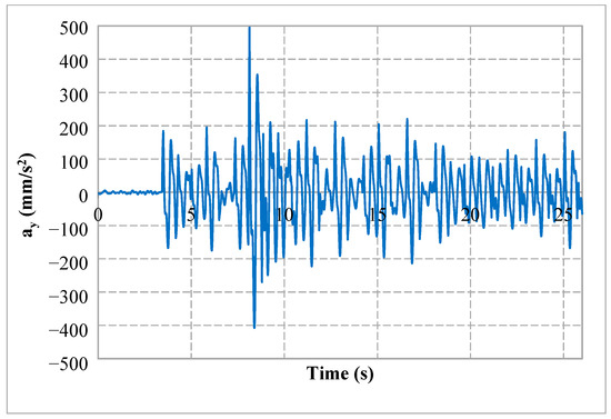 Figure 20, Figure 21 and Figure 22 show the variation in time of the accelerations of the excavator’s boom structure for the X, Y, and Z directions in the case of a shock load. In transient mode, the maximum acceleration value is obtained on the Y direction and is 495 mm/s2.