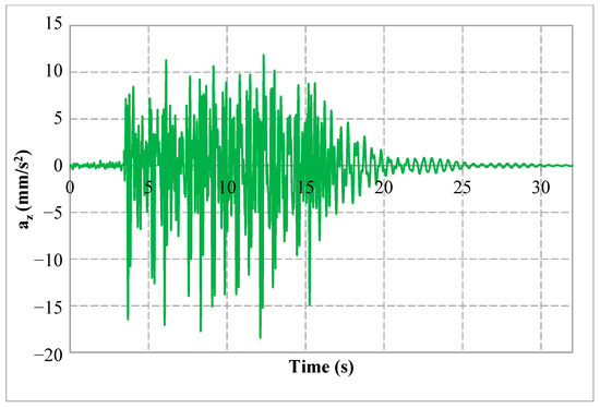 The free vibrations resulting after the force had stopped became null over time. This period of time was determined by the global damping that was imposed on the model under consideration. Higher damping resulted in a shorter transient period, a faster cancellation of the free vibrations, and an increase in acceleration values for all directions.