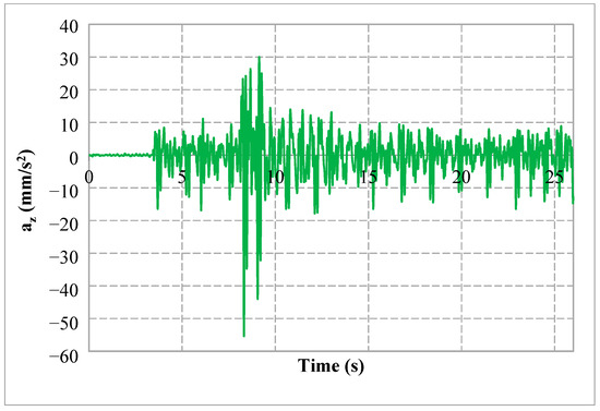 The diagrams in Figure 9 and Figure 10 represent forces generated by the excavation process (cutting and lifting of the material). Their frequency is determined by the angular rotation speed of the bucket wheel and the number of buckets (both cutter and cutter–loader buckets) fitted to the bucket wheel, while their magnitude is given by the hardness of the excavated material [8]. To determine the time response of the BWE’s boom, a Workflow Sensitive type virtual sensor was placed exactly at the origin of the coordinate system shown in Figure 2.