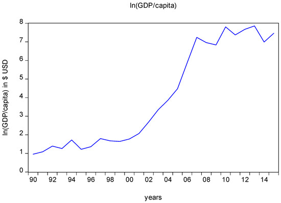 The variables employed in the study are illustrated in the following Figure 1 and Figure 2, respectively. Figure 1 depicts the evolution of GDP per capita for the time period between 1990–2015. Specifically, there is an evident sharply increasing trend over the period from 2004 to 2005, whereas in the last decade, the GDP per capita has been doubled, and has been stable ever since.