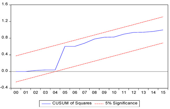 In the last step of the analysis, a sensitivity test was performed, through which parameter stability and goodness of fit is tested, which includes the cumulative sum of squares of recursive residuals (CUSUM test). The parameter stability is ensured in case the graphs mentioned above lie within the bounds [65,66].