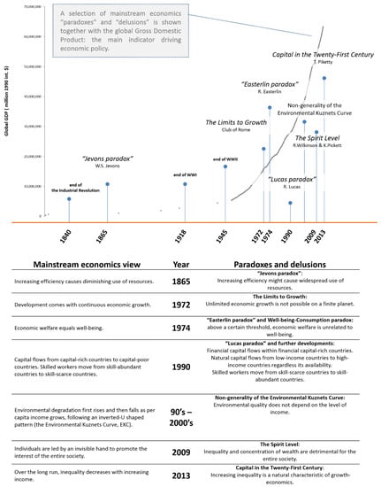A chronological selection of paradoxes and delusions of the mainstream economics view. Global gross domestic product trends are shown in the background. Data from the Maddison Project Database [22] (available at: http://rug.nl last accessed: May 2019), and the World Bank Open Data (available at: http://data.worldbank.org/ last accessed: April 2017).
