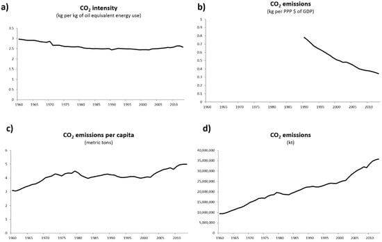 One example of the Jevons paradox and the dematerialization delusion is CO2 emissions at the global scale. Despite the fact that CO2 emitted per unit of energy use has diminished from 1960 to 2013 (a), and CO2 emissions per unit of GDP in purchasing power parity have also diminished from 1990 to 2013 (b), total emissions of CO2, and also emissions per capita, increased over the same period (c, d), just like CO2 concentration in the atmosphere (https://www.esrl.noaa.gov/gmd/ccgg/trends/, accessed on 3 April 2018). Data from the World Bank Open Data (available at: http://data.worldbank.org/ last accessed: April 2017).