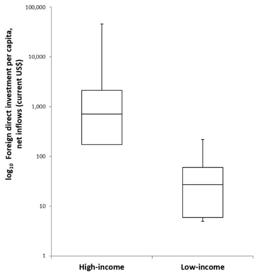 The distribution of the 2015 net inflows of foreign direct investments (log10 current US$) in high- and low-income countries (n = 83) provides a salient example of the Lucas paradox. High-income countries are the recipient of around 99% of all global foreign investments. Data are from the World Bank Open Data (available at: http://data.worldbank.org/ last accessed: April 2017).