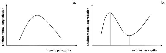For example, if increasing air pollution increases the death toll [80], it is questionable how this impact would be reversed once high levels of economic growth are reached. Moreover, in some cases an N-shaped EKC has been recognized [81,82,83,84], indicating a further inversion in the profile of the curve, with environmental degradation restarting to grow beyond certain levels of income (Figure 5b).