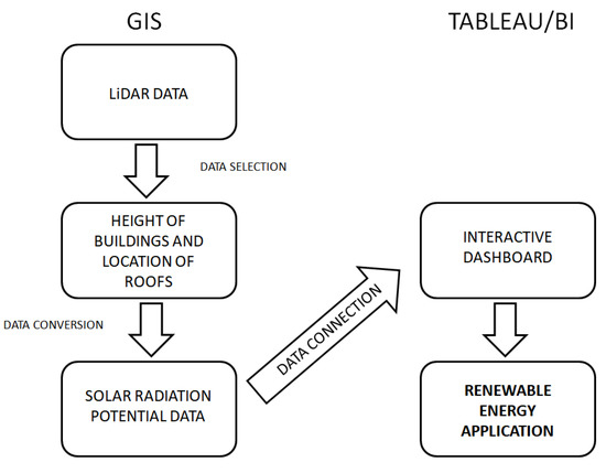The input data were represented by a Light Detection and Ranging (LiDAR) dataset, which was a base for the extraction of buildings together with height information. The input data were a basis for solar radiation calculations, and then connection with the BI tool. The use of spatial data in Tableau software allowed for interactive dashboard building. The result of this connection and dashboard building was a detailed model for renewable energy application.