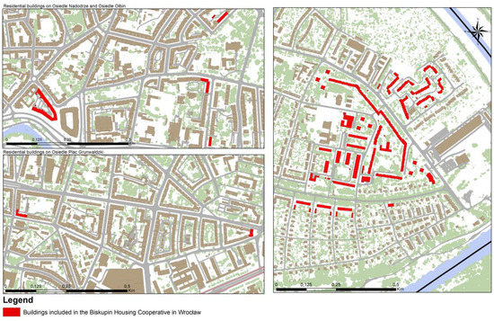 Buildings included in the “Biskupin” Housing Association in Wrocław in particular settlements. Source: Own elaboration using ArcGIS.