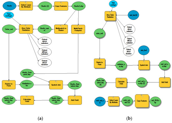 Workflow of model calculation: (a) presents the solar radiation potential of rooftops (SOLIS) calculation workflow; (b) presents the modified model calculation workflow. Own elaboration using ArcGIS.