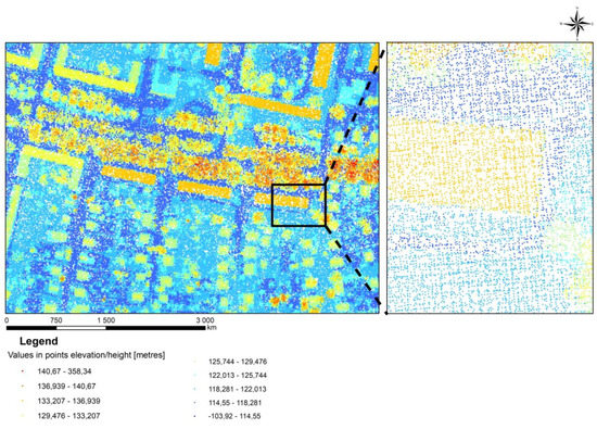 In the analyzed area, urban development, the average density of points is 12 points/m2. The data are available in LAS format and divided into the eight classes [49]. In order to obtain information about the minimum and maximum height of individual buildings from the LAS layer, it was necessary to select the data class named “6 BUILDING”, which only shows buildings. The data conversion allows obtaining the altitude of the buildings, on the basis of which we can obtain data for the model.
