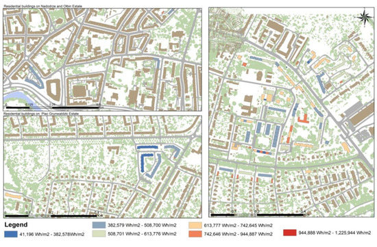 Solar potential per 1m2 of roof properties included in the “Biskupin” Housing Cooperative in Wroclaw. The values of solar radiation are shownusing a blue–red color palette. The dark blue represents buildings with the lowest value of solar potential, the dark red represents the highest values of solar potential. Source: Own elaboration using ArcGIS.