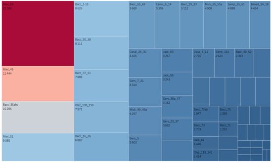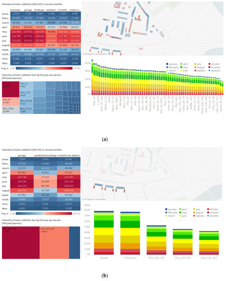 Based on the obtained data, an interactive model of environmental management for the housing association was created in the Tableau program. The model includes a decision support tool for assessing the solar potential. This program is used to visualize the obtained data graphically and is easier to interpret. With the help of the tool, it will be possible to select the appropriate location of the solar installation by comparing the solar potential of individual buildings (Figure 6).