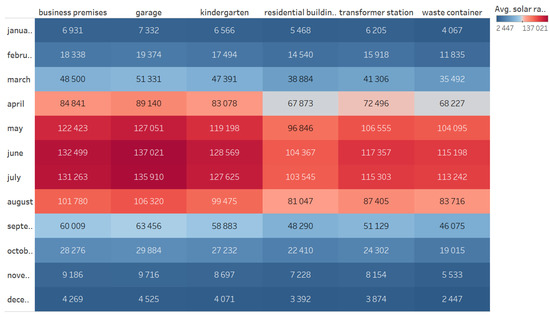The largest average solar potential in terms of the size of the building is garages and commercial premises. However, all properties have solar potential at a similar level. The total solar intensity in the month with the highest potential in June is for garages 137,021 Wh/m2. In almost every type of property, the period of the highest potential of solar radiation occurs from April to September (Figure 7).