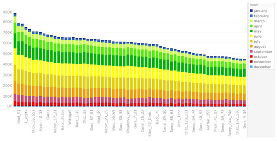 The model allows for the detailed analysis of the annual intensity of solar radiation. Therefore, itis possible to verify the annual value of solar radiation per given property, as well as the verification of solar potential during each month. The graph below presents the values of solar intensity per 1m2 of real estate. The biggest potential in the year is the building located at Canallette 6-14 street, approx. 900,000 Wh/m2, which is a value higher than the average potential of solar radiation intensity in the whole of Wrocław—828,924.8 Wh/m2. The smallest potential was recorded on the roofs of real estates located in Gersona 4-14 street and Olszewskiego 132-136—approximately 400,000 Wh/m2 (Figure 9). The highest annual solar potential is located in the building at Canalette 6-14. This is due to the fact that the building is high, has 5 storeys, with a total height of 12m. In addition, the roof of the property is flat, which allows for higher possibilities of accumulating solar energy. In the months with the highest intensity of solar intensity, the potential ranges from 80,000 to 100,000 Wh/m2 of roof. The lowest solar potential occurs in January, November and December and its maximum value is up to 10,000 Wh/m2. However, the building with the lowest solar intensity is the property located at Gerson 4-14. The maximum intensity in months with the highest solar radiation is approximately60,000–80,000 Wh/m2. The roof of the property is more divided (due to existing chimneys), which affects the total value of solar intensity. The largest share of energy possible to accumulate is in the period from May to September. The difference in the amount of intensity in some months is even several times higher. An example of this is the value of solar radiation intensity in real estate with the highest potential. In January, the intensity value is 8313 Wh/m2 and in June as much as 153,338 Wh/m2.