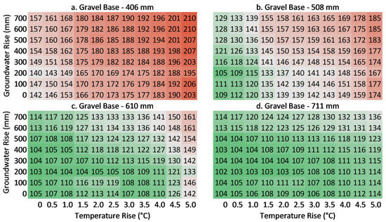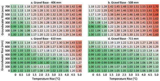 Ratio of O-HMAT, GW/O-HMA0,0 for incremental temperature and groundwater rise. The color convention is minimum (green) to maximum (red). Four gravel-base thicknesses are shown: (a). 406 mm, (b). 508 mm, (c). 610 mm, and (d). 711 mm.