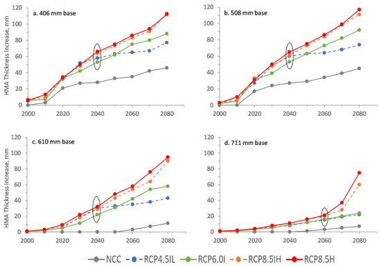 HMA thickness increases needed to achieve O-HMA thickness for no climate change (NCC) and four climate-change scenarios: RCP4.5IL, RCP6.0I, RCP8.5IH, and RCP8.5H. Four gravel base-layer thicknesses are presented: (a) 406 mm, (b) 508 mm, (c) 610 mm and (d) 711 mm.