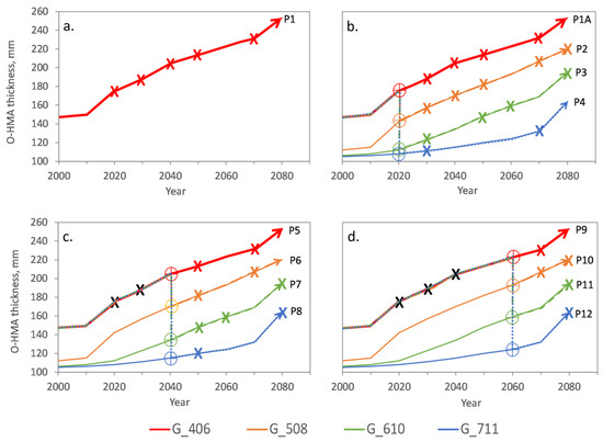 Adaptation pathways (a) P1, (b) P1A to P4, (c) P5 to P8, and (d) P9 to P12 shown as the calculated O-HMA thickness vs. time for RCP8.5IH. The colors represent the base-layer thickness as follows: red-406 mm (P1, P1A, P5, P9), orange-508 mm (P2, P6, P10), green-610 mm (P3, P7, P11), blue-711 mm (P4, P8, P12). Colored Xs represent the HMA overlays for individual pathways. Black Xs represent overlays in all pathways within each subplot. Bull’s eyes represent base-layer rehabilitation with colors corresponding to the final base-layer thickness.